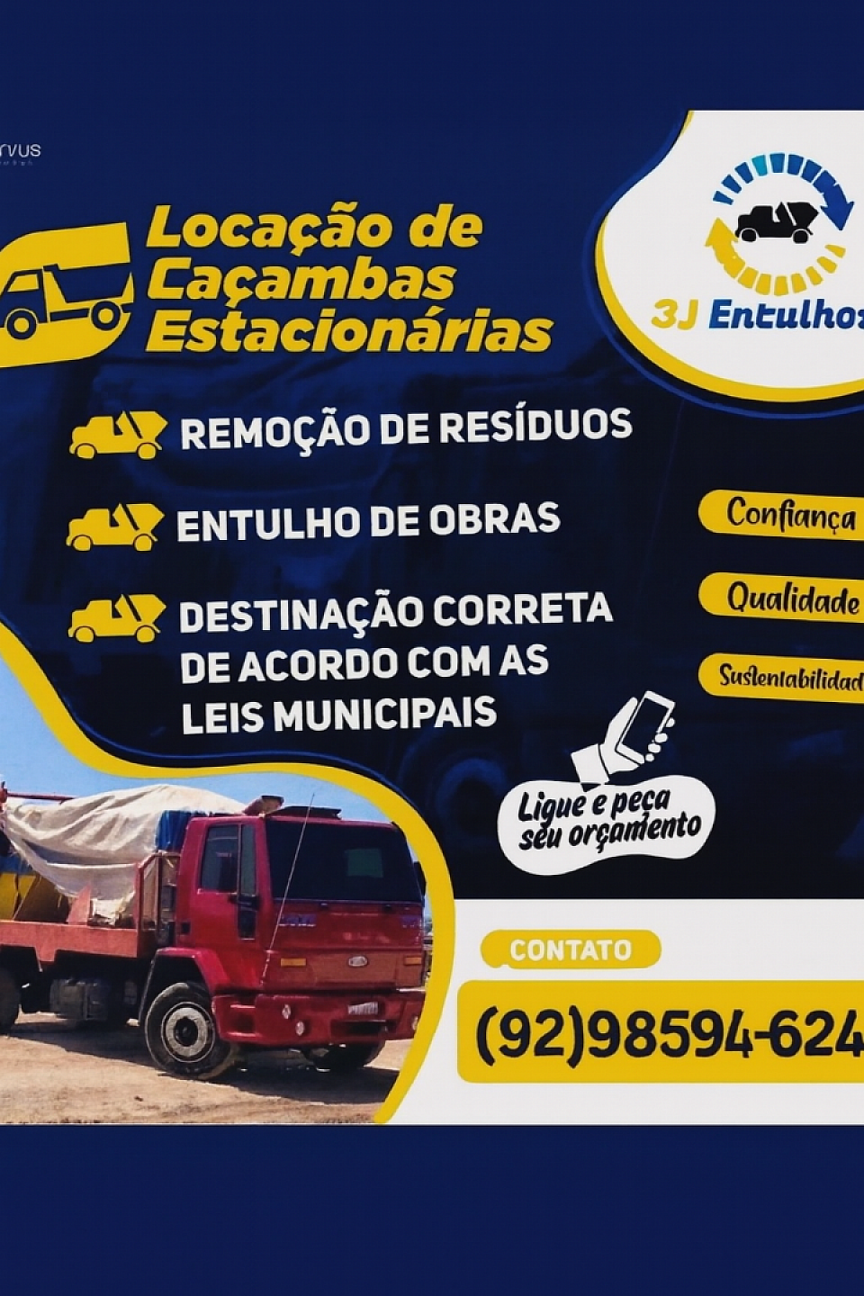 3J Caixas de Entulho Manaus Solução prática, rápida e segura para remoção de entulho em Manaus. Trabalhamos com aluguel de caixas coletoras para obras, reformas, limpezas e descarte de resíduos, sempre com responsabilidade e pontualidade. Atendemos residências, comércios e empresas, garantindo agilidade na entrega e retirada das caixas. Se você precisa de organização, economia de tempo e um serviço de confiança, conte com a 3J Caixas de Entulho Manaus. 📞 Contato: 92 98594-6242 Atendimento rápido e compromisso com o cliente.